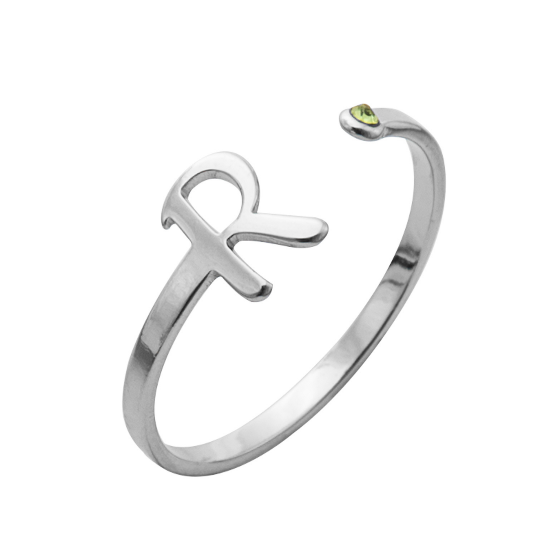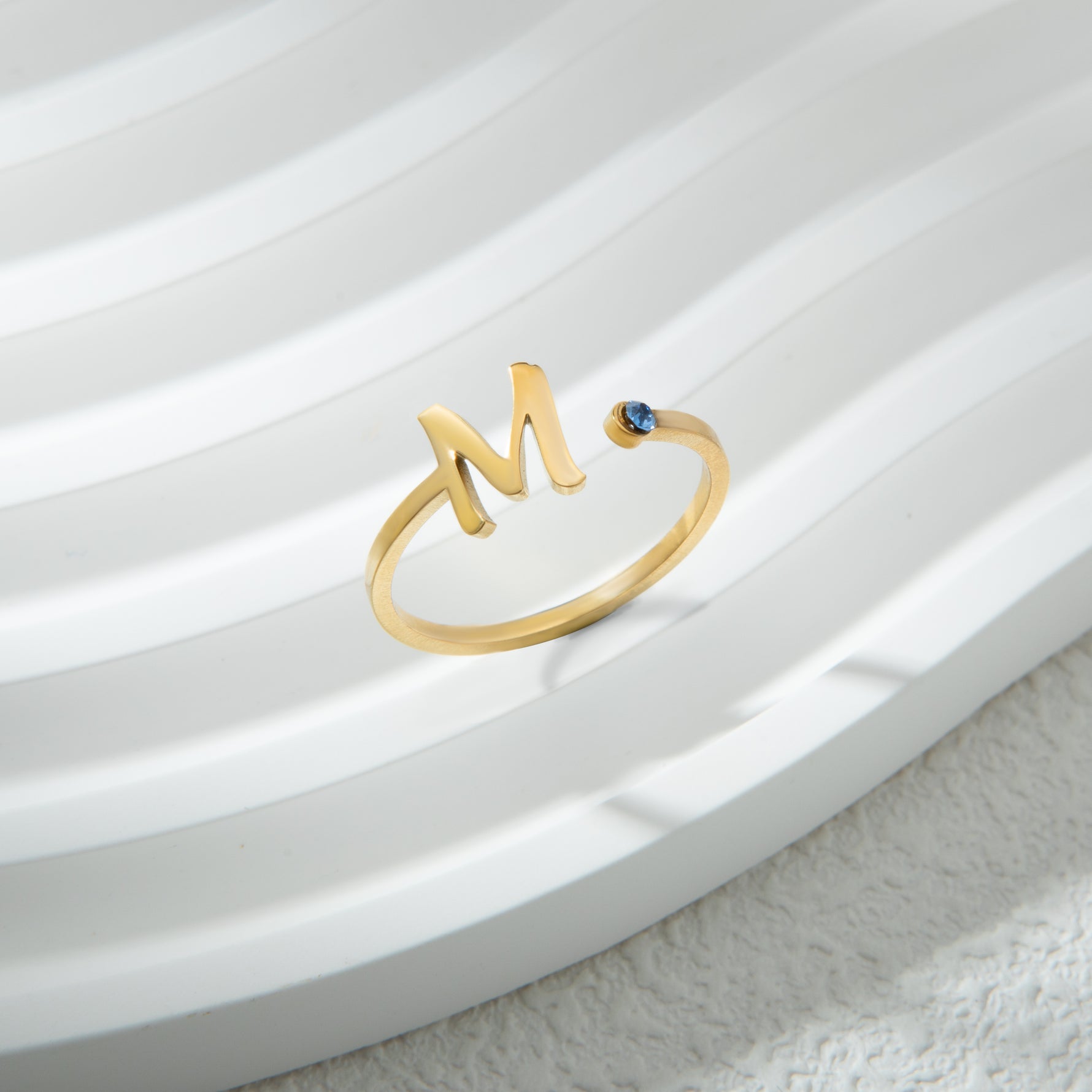 This delicate open-band design features your chosen initial and a brilliant birthstone, blending timeless charm with a personal touch.