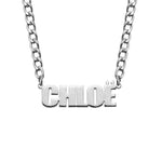 A gold-plated personalised name necklace with the name 'CHLOE' written in bold, standout font, attached to a thick chain.