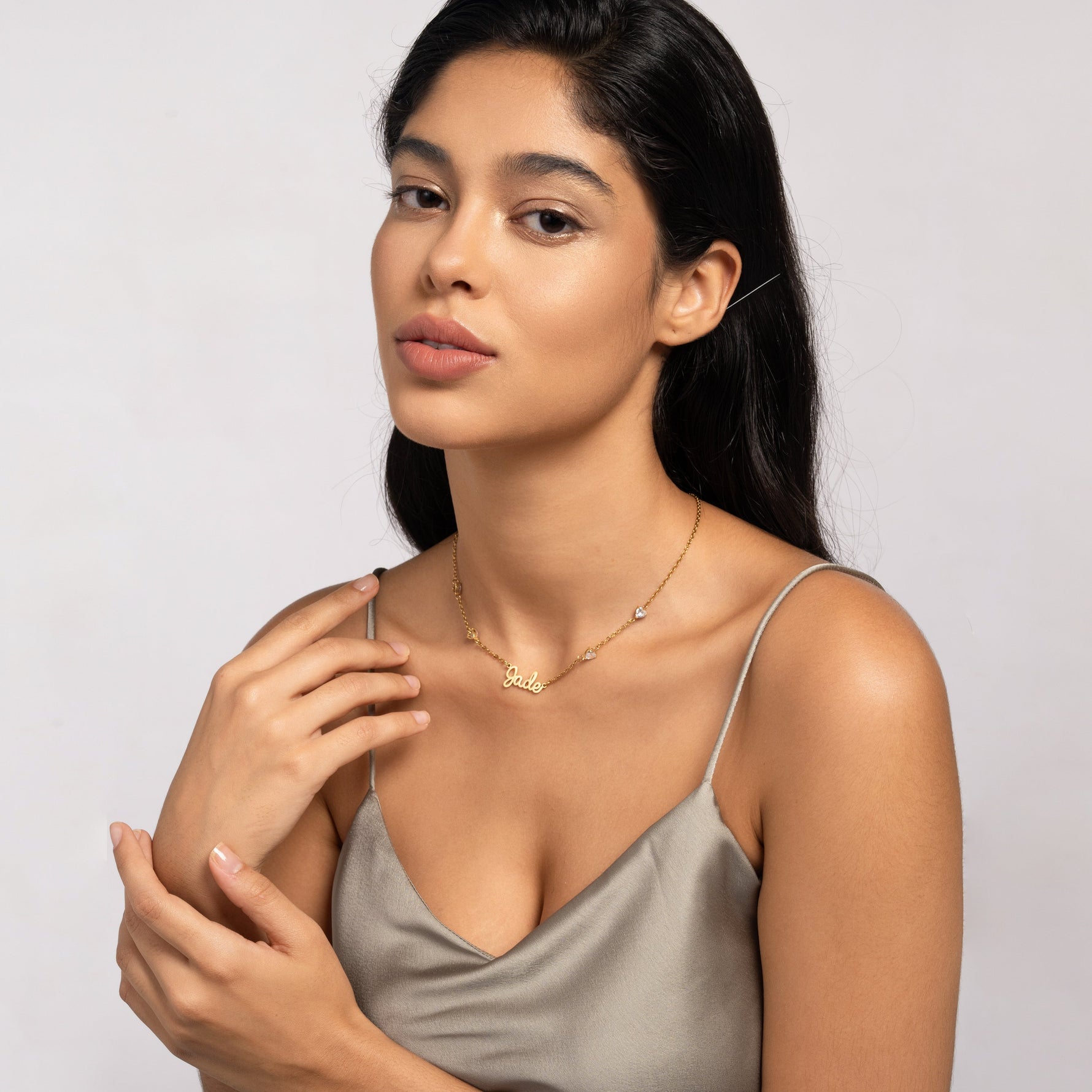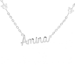 The Name Necklace with 4 Clear Crystal Hearts is the epitome of subtlety meeting sparkle. Designed to capture and reflect light with every movement, this elegant piece features a name cut out in precise cursive letters, suspended on a chain available in gold, silver, or rose gold.