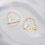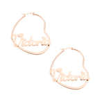 Discover our stunning pair of heart-shaped hoop earrings personalized with your name or favorite text! The earrings are closed for added security and feature a heart at the center with your text inscribed inside. The dots over the "i"s are replaced with small hearts for a romantic touch.