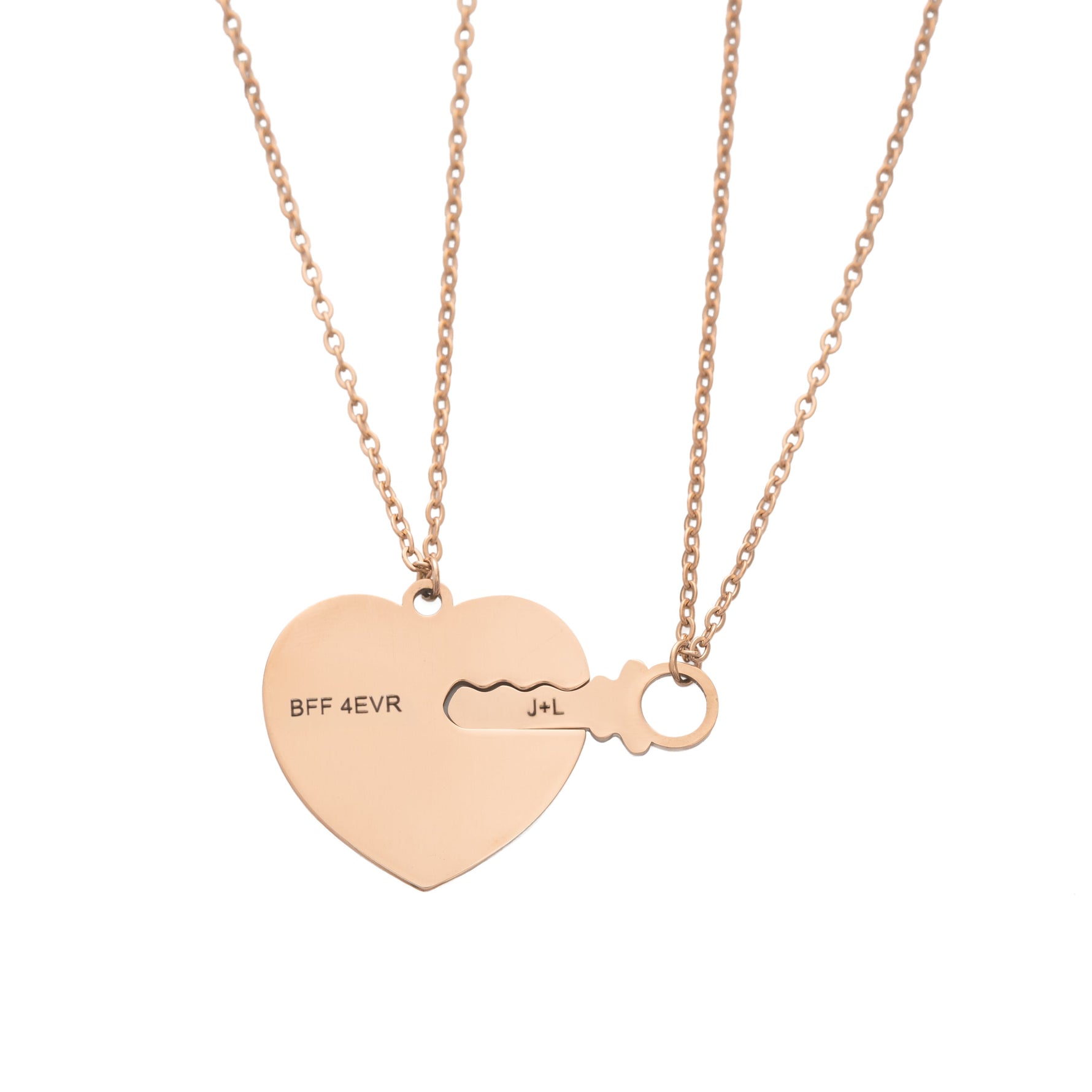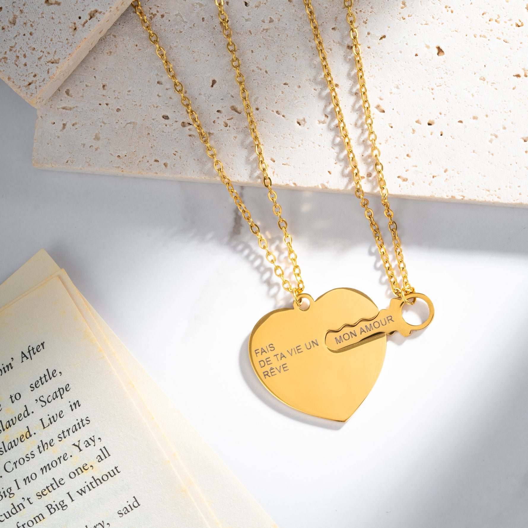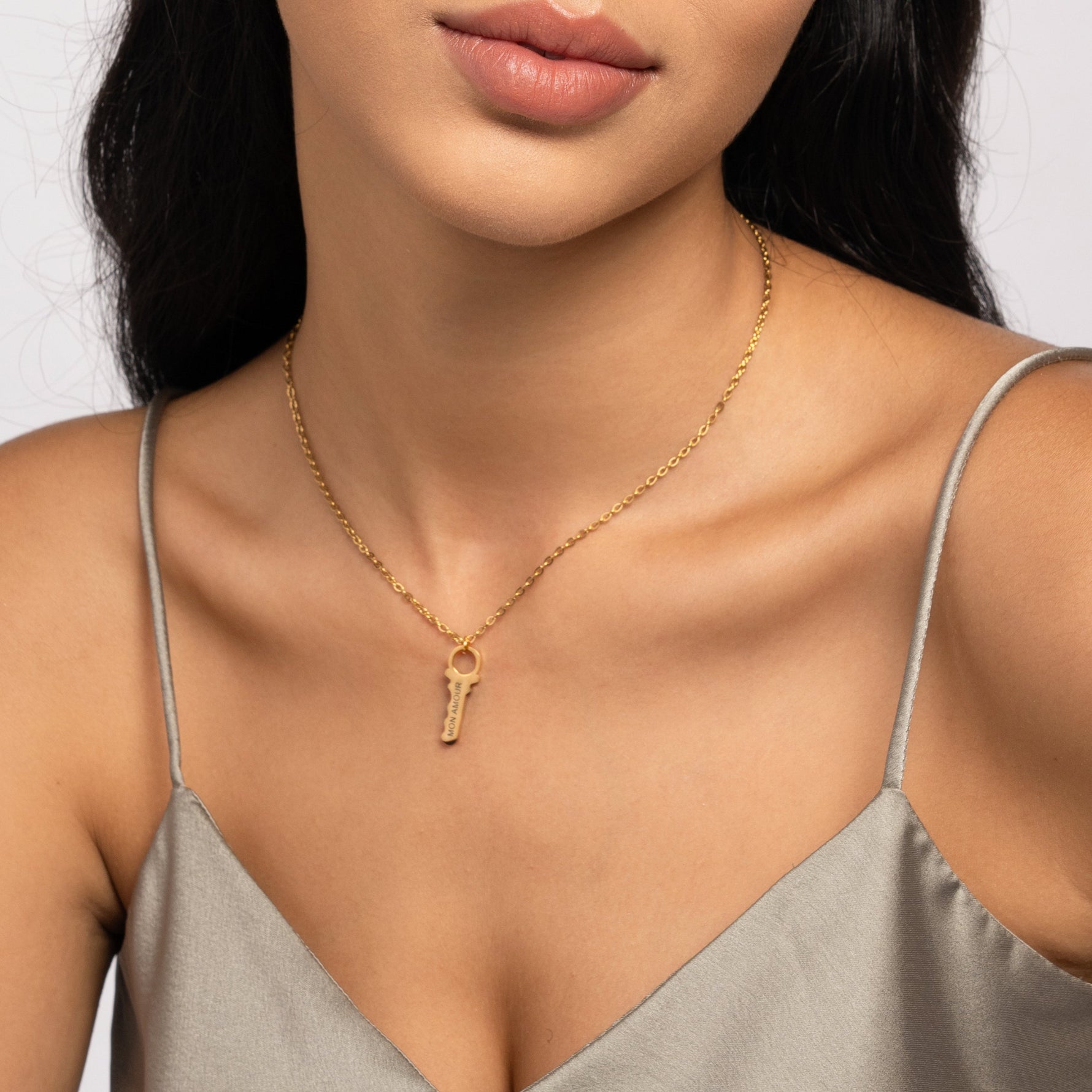 This sophisticated necklace features a heart-shaped locket available in gold, rose gold, or silver finishes that can be engraved with a special message, initials, or a significant date. Alongside it, a delicate key dangles, complementing the engraved message on the heart and symbolizing the exclusive access to the secrets and stories held close to the heart.
