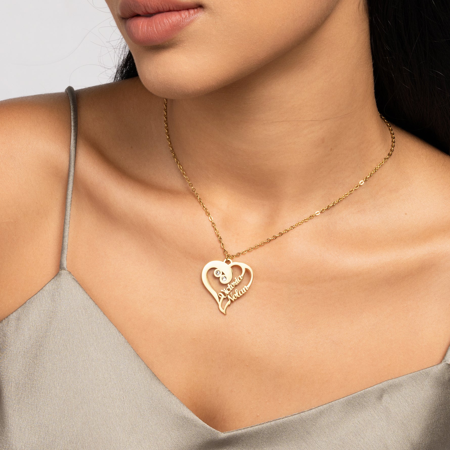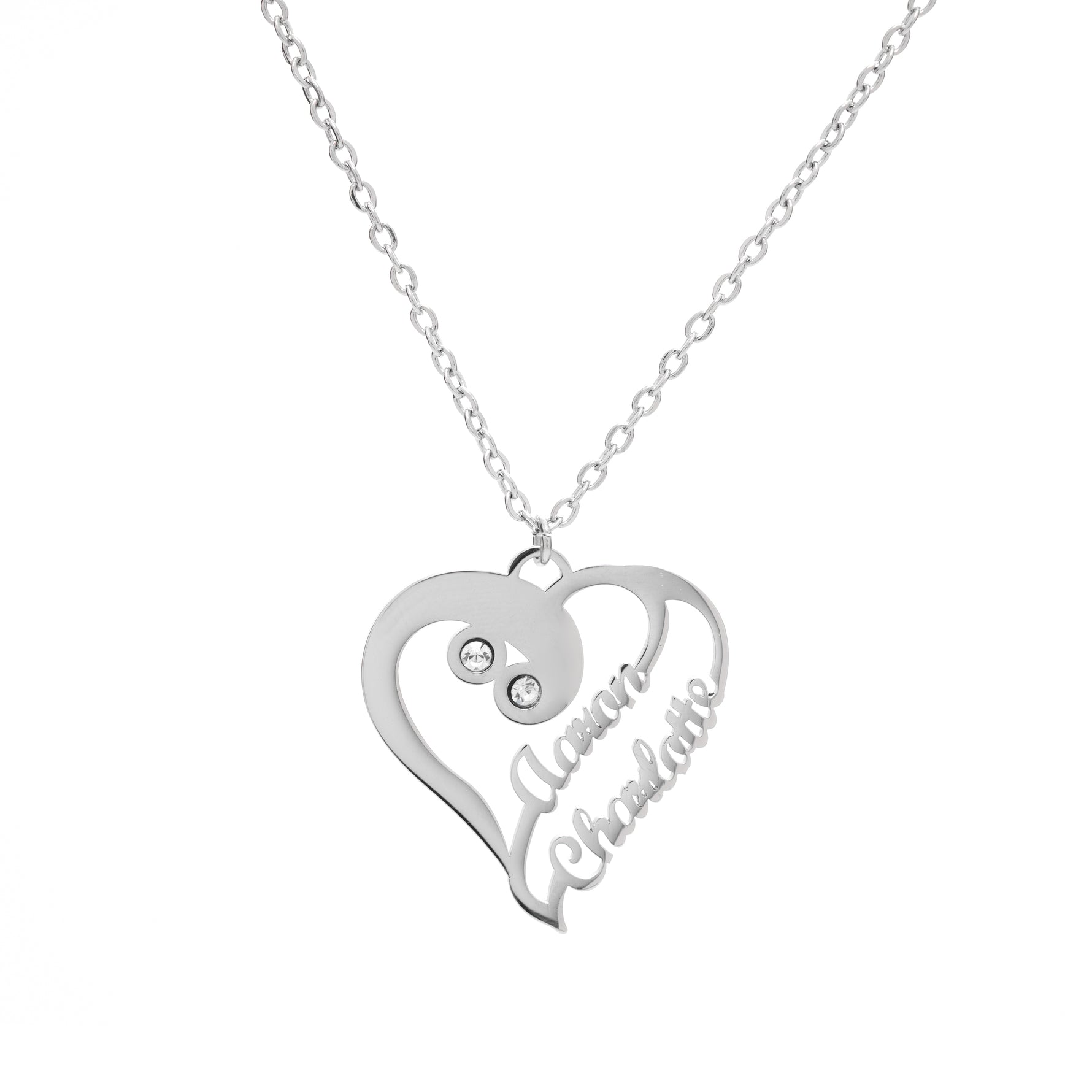 This piece of jewellery is much more than a simple accessory. It is an elegant and meaningful expression of affection and individuality. Encased in delicate cursive script, the heart-shaped pendant can be personalised with two first names or words of your choice, creating a unique and intimate symbol of love.