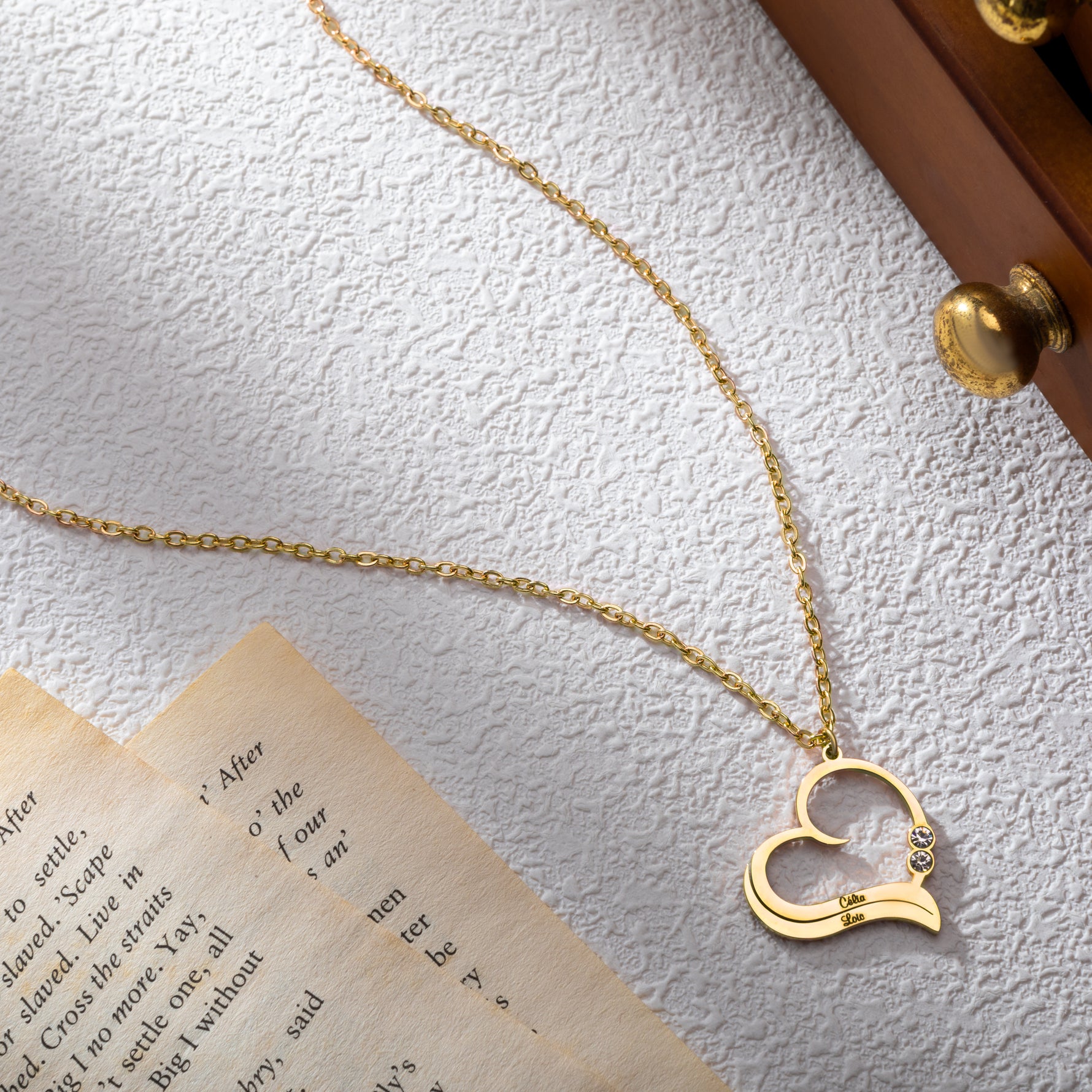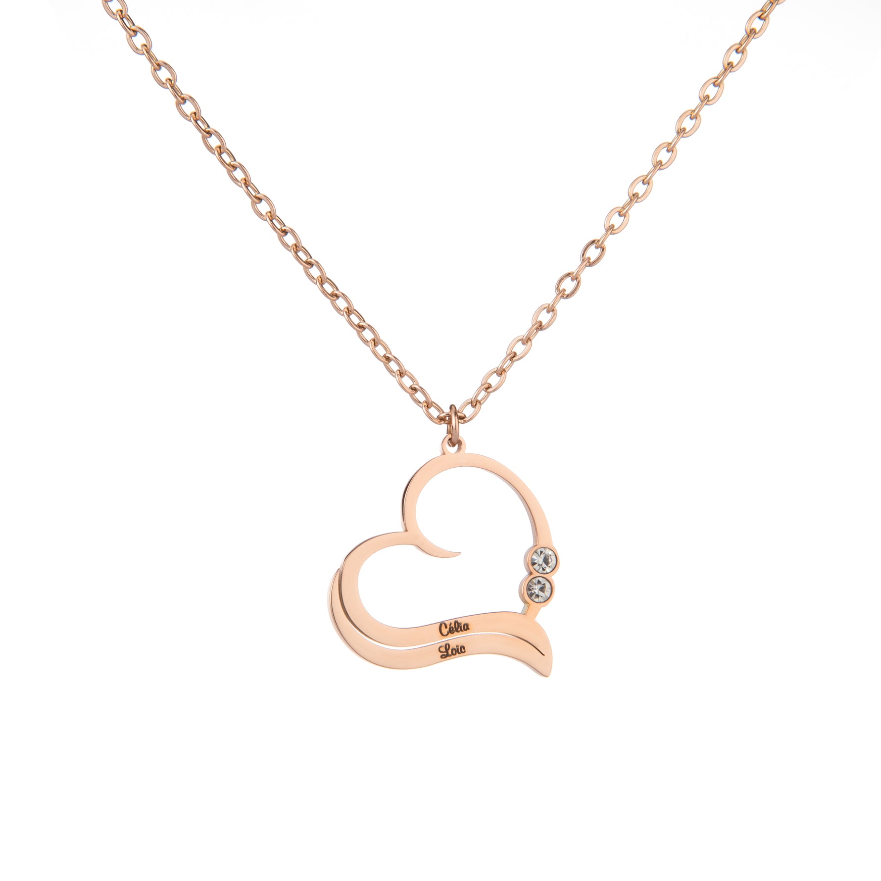 A beautiful way to cherish love and connection. This open heart necklace is personalised with two engraved names and adorned with shimmering clear crystals. A delicate and thoughtful gift for a loved one. Available in gold-plated, silver, or rose gold stainless steel, with four length options.