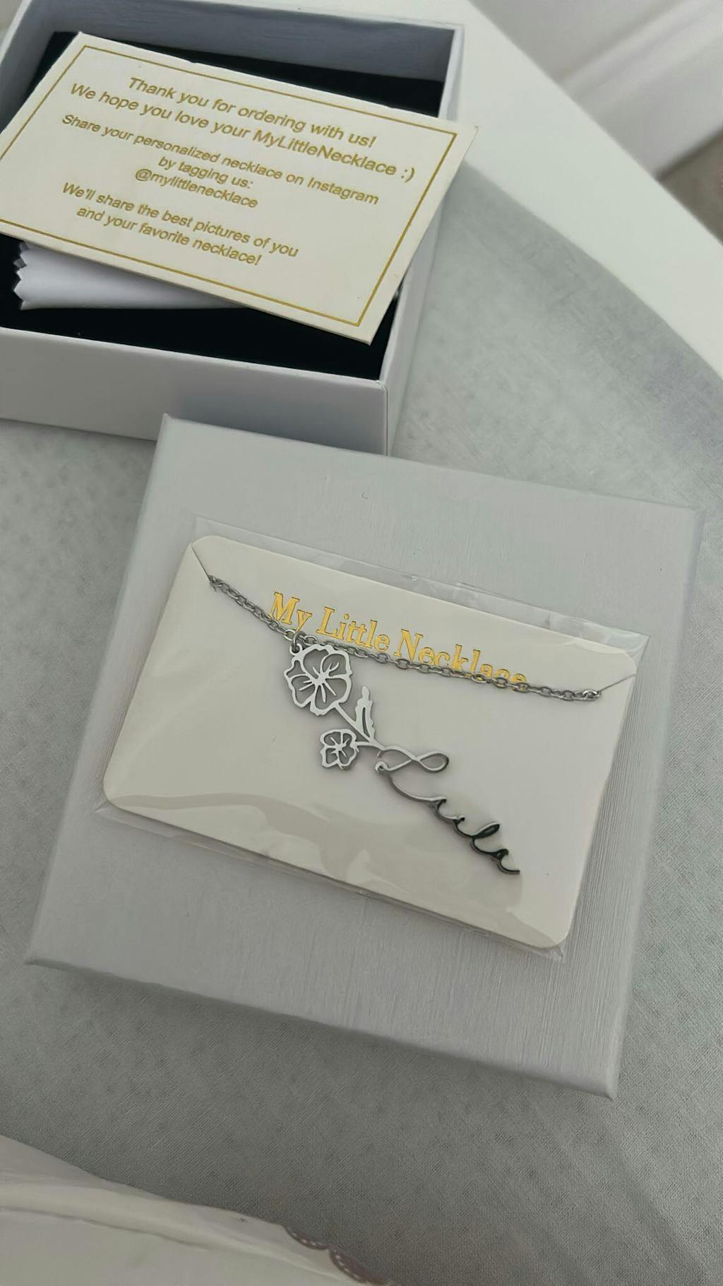 This necklace is a unique piece of jewelry that combines elegance and personalization. The flower adds a touch of delicacy to the piece, making it a perfect choice for any occasion. Whether it's for a birthday, Mother's Day, or simply to indulge, this name necklace is a perfect gift.
