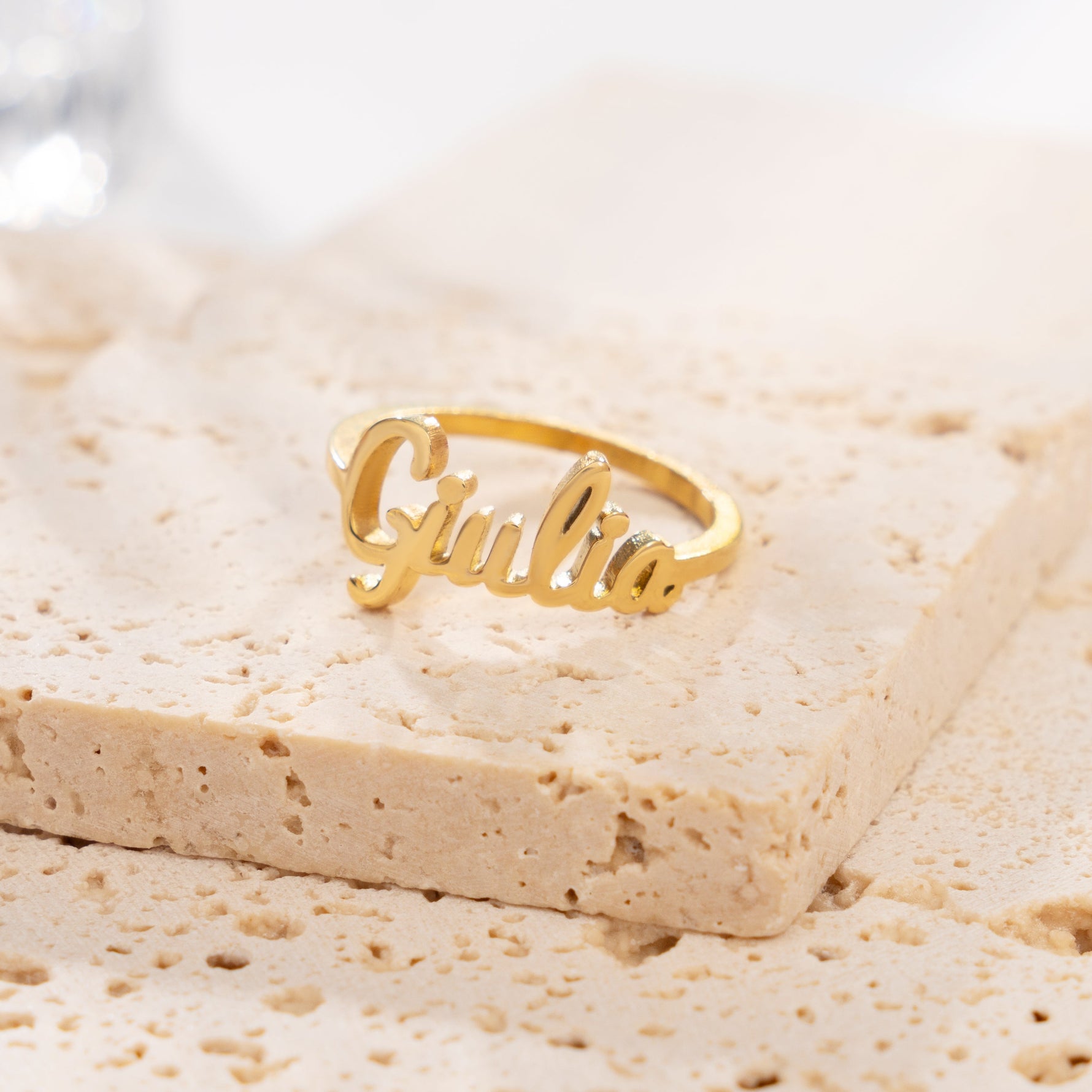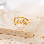 Discover our Personalised Cursive Name Ring, an elegant piece made from high-quality stainless steel, available in Gold, Silver, and Rose Gold finishes. Customize it with a name or word in cursive script, creating a unique and refined symbol of your individuality. Perfect for expressing yourself or as a meaningful gift, this ring combines sophistication and personal significance.