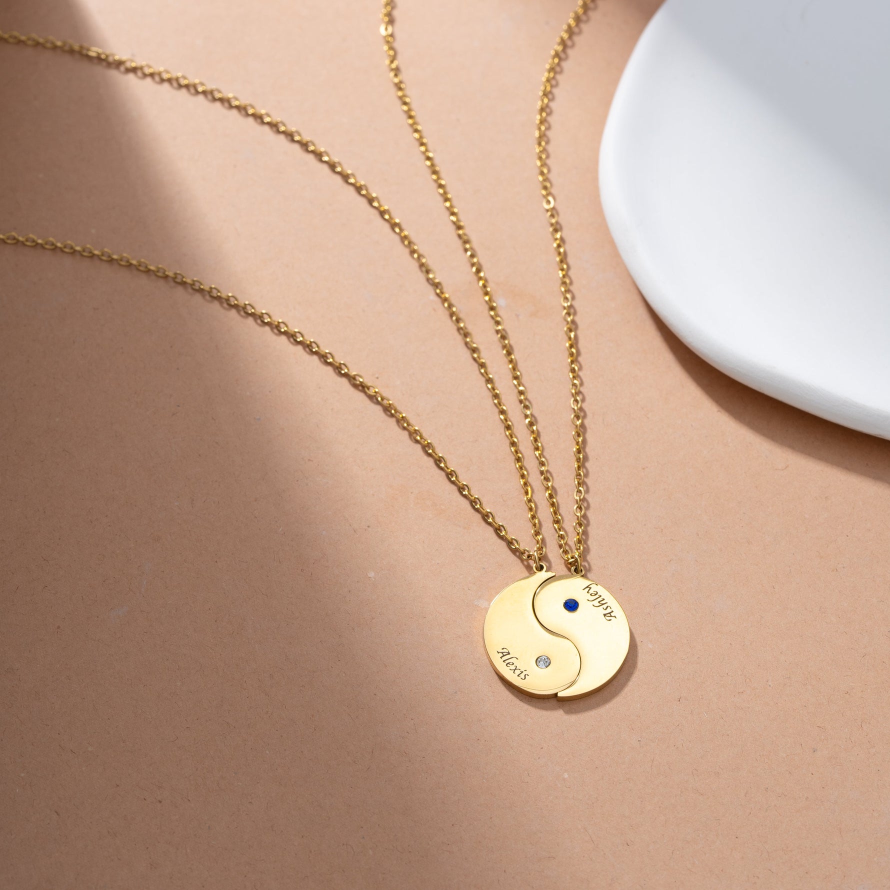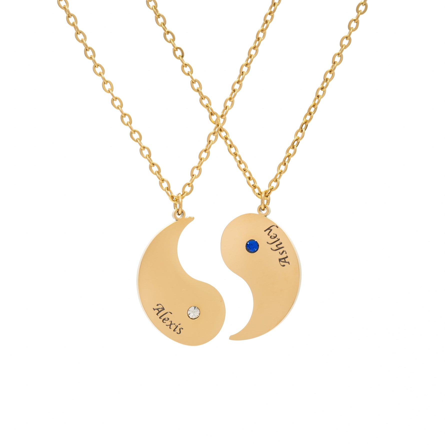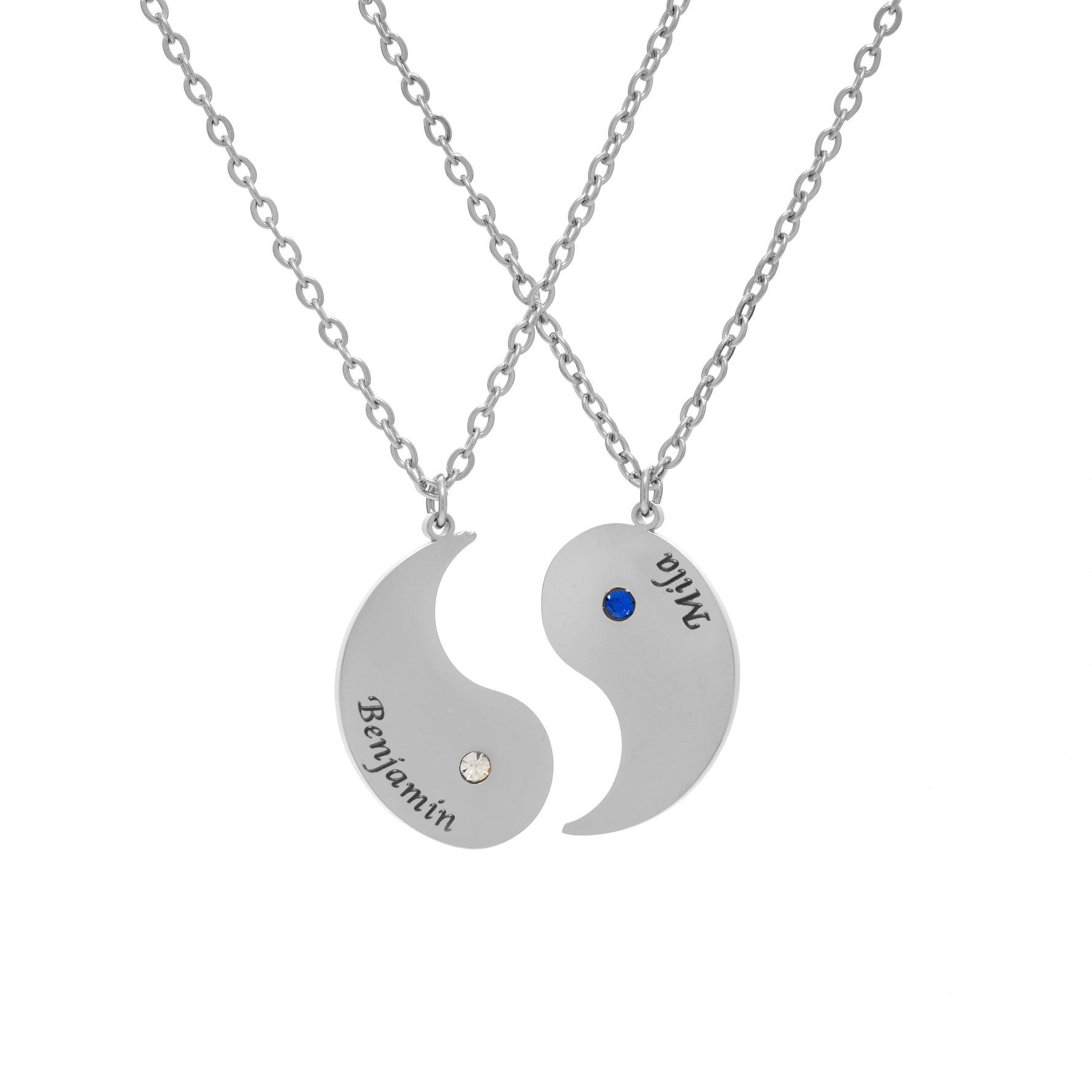 Each pendant displays half of the traditional yin & yang shape, and one of them is adorned with a birthstone, adding a personal touch as well as a burst of color specific to the wearer's birth month. This gemstone is not just an aesthetic detail but also a symbol of the individual's unique identity.
