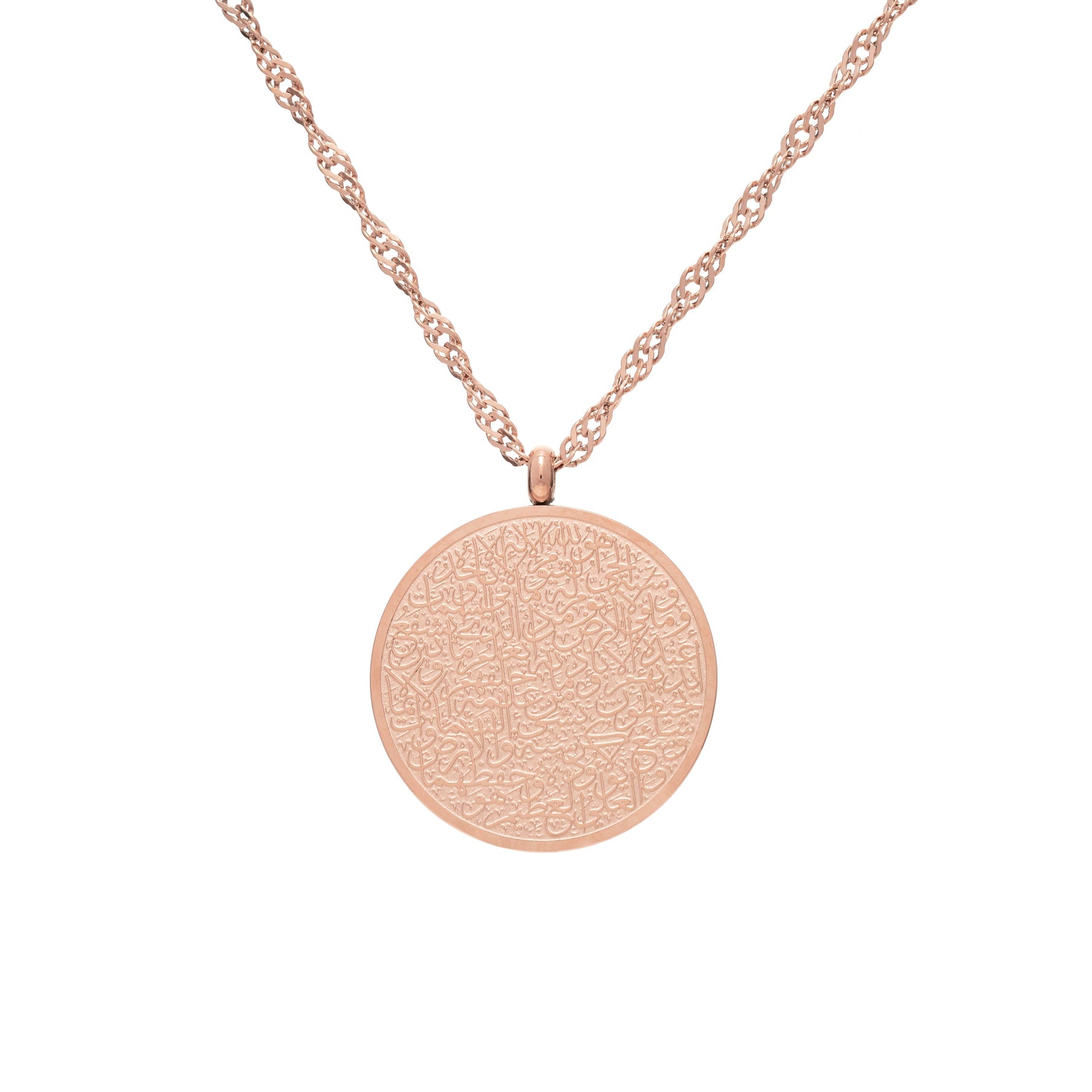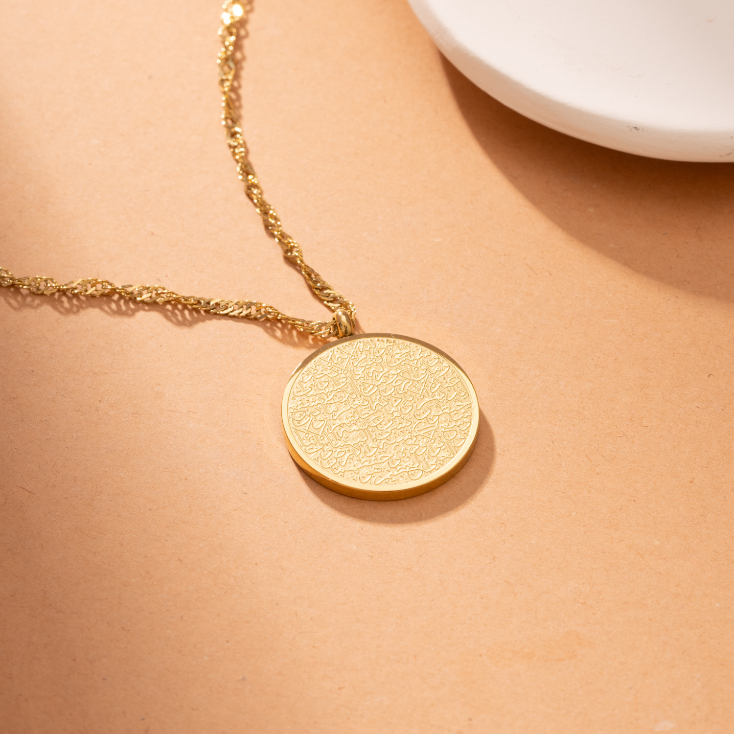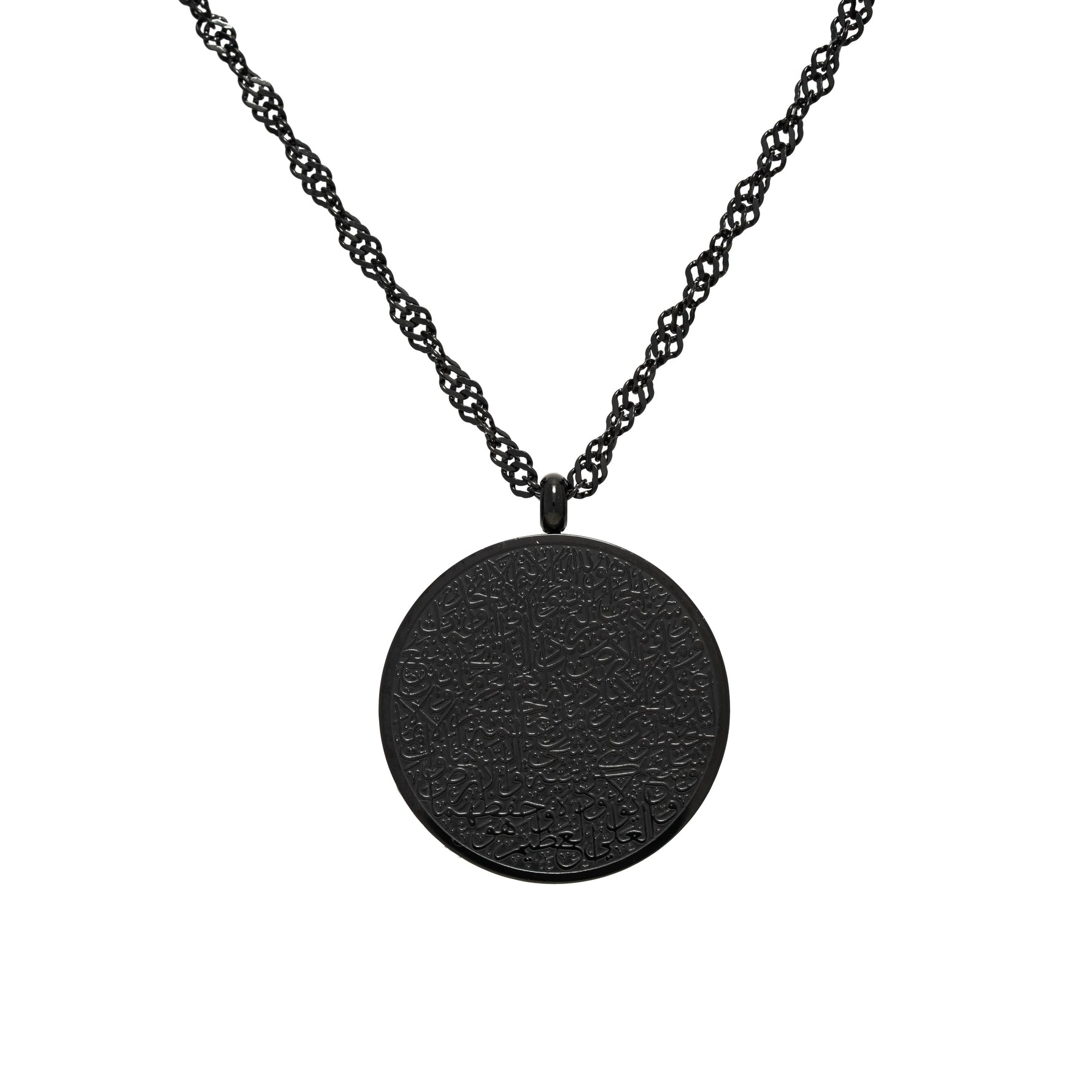 The powerful Ayatul Kursi, often considered the Verse of the Throne, is beautifully embodied in this round pendant, offering a symbol of divine protection and a spiritual anchor for its wearer.