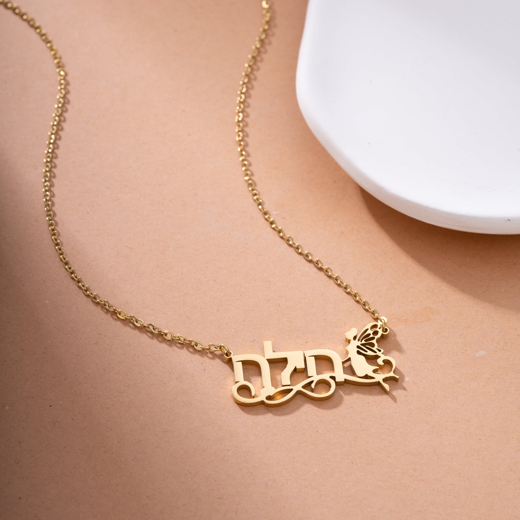 - Personalized Design: Your name elegantly crafted in Hebrew script, accompanied by a graceful fairy, adds a touch of magic to this unique necklace.